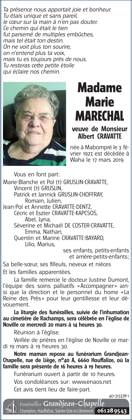 Décédée à Waha (6900) le dimanche 17 mars 2019 à l'âge de 92 ans