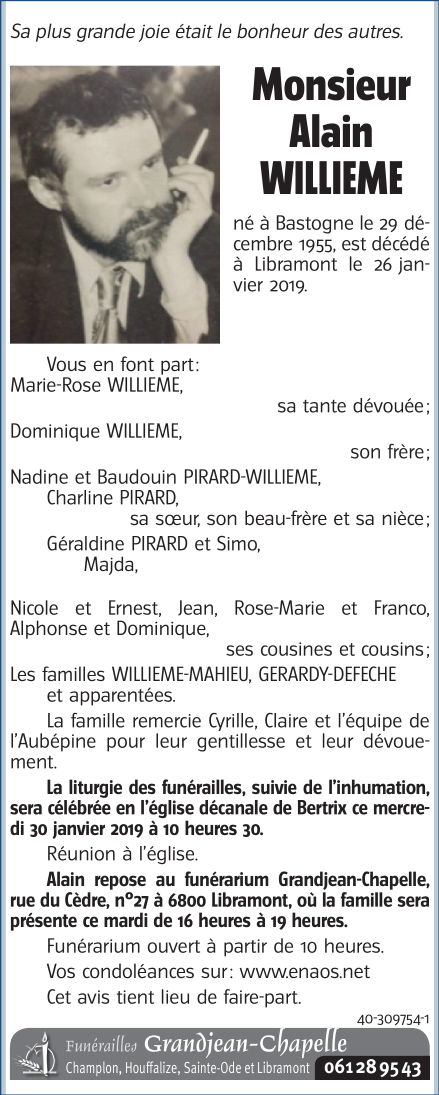 Décédé à Libramont (6800) le samedi 26 janvier 2019 à l'âge de 63 ans