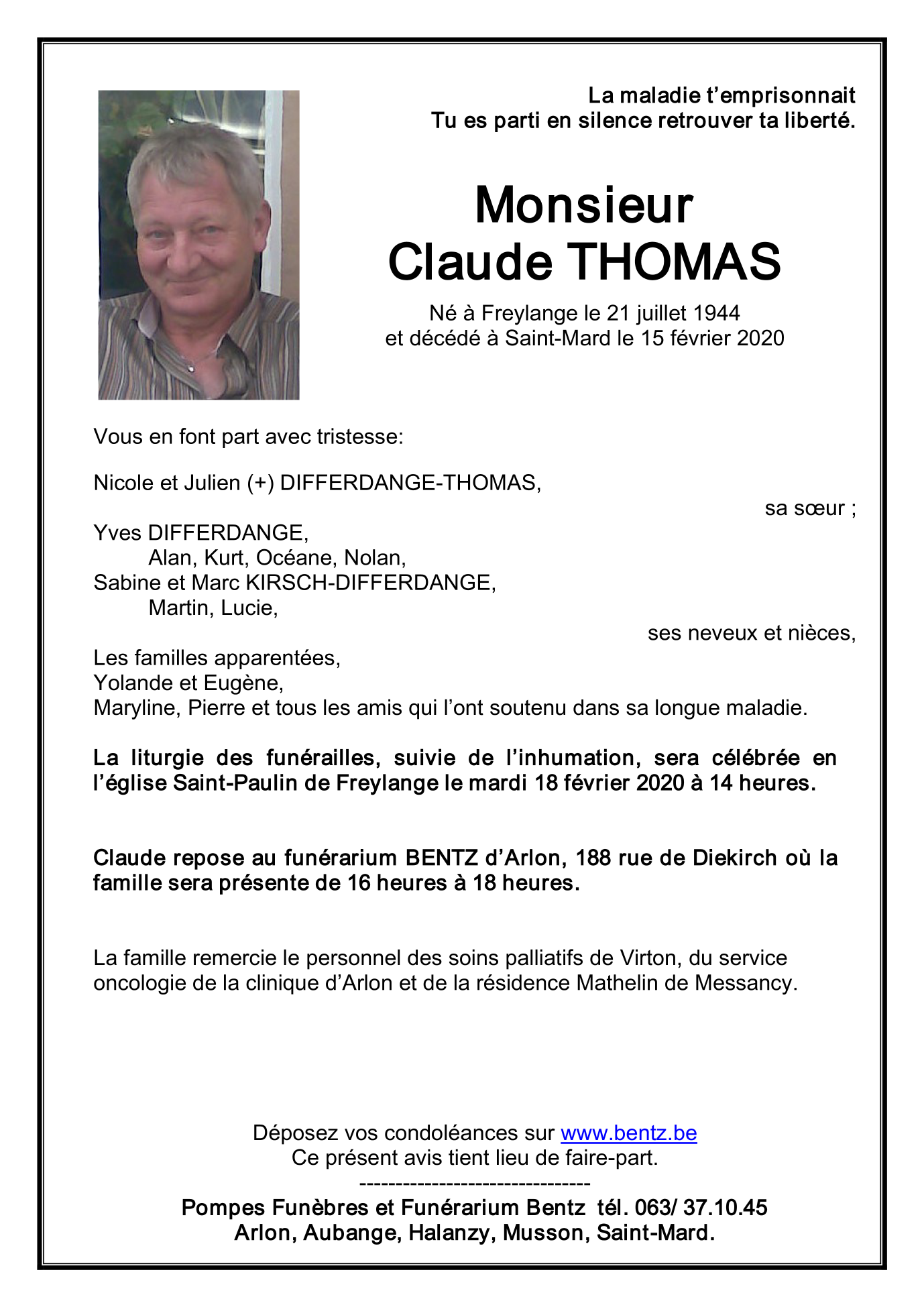 Décédé à Saint-Mard (6762) le samedi 15 février 2020 à l'âge de 75 ans