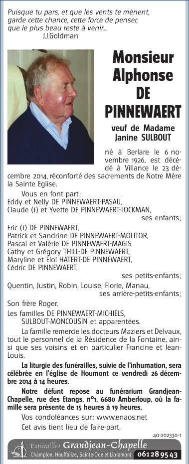 Décédé à Villance (6890) le mardi 23 décembre 2014 à l'âge de 88 ans