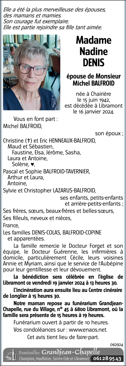 Décédée à Libramont (6800) le mardi 16 janvier 2024 à l'âge de 81 ans