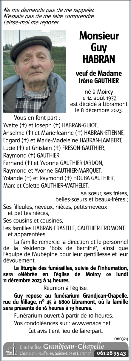 Décédé à Libramont (6800) le vendredi 8 décembre 2023 à l'âge de 86 ans