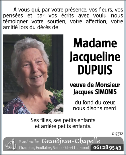 Décédée à Houffalize (6660) le jeudi 16 décembre 2021 à l'âge de 87 ans