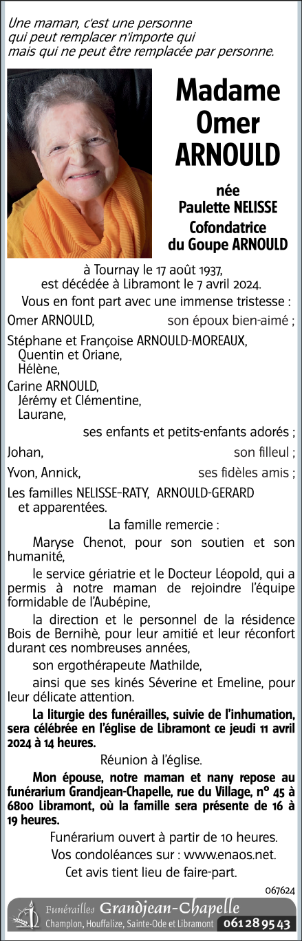 Décédée à Libramont (6800) le dimanche 7 avril 2024 à l'âge de 86 ans