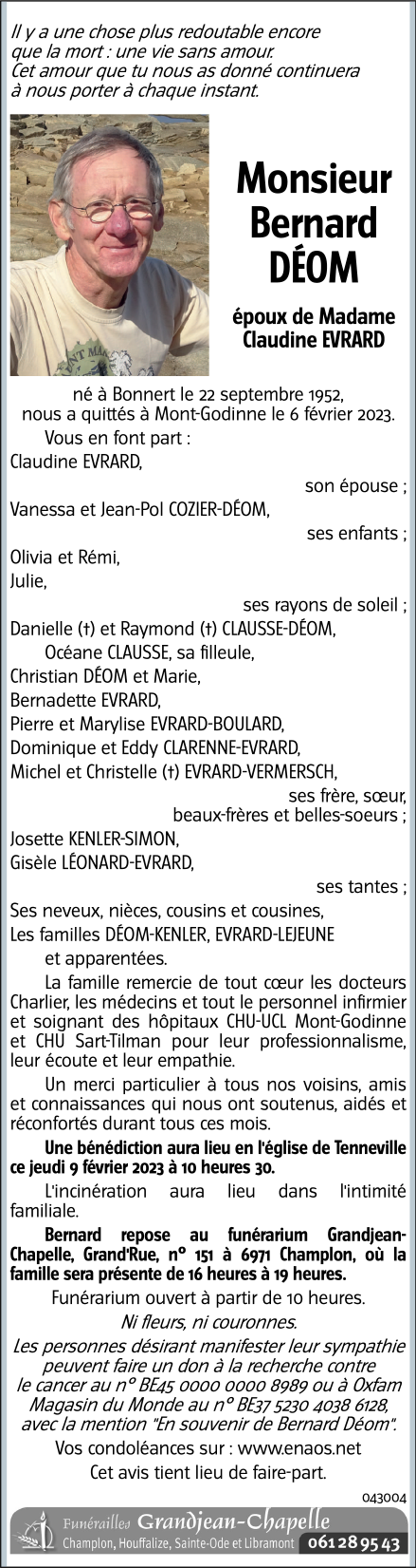 Décédé à Mont-Godinne (5530) le lundi 6 février 2023 à l'âge de 70 ans