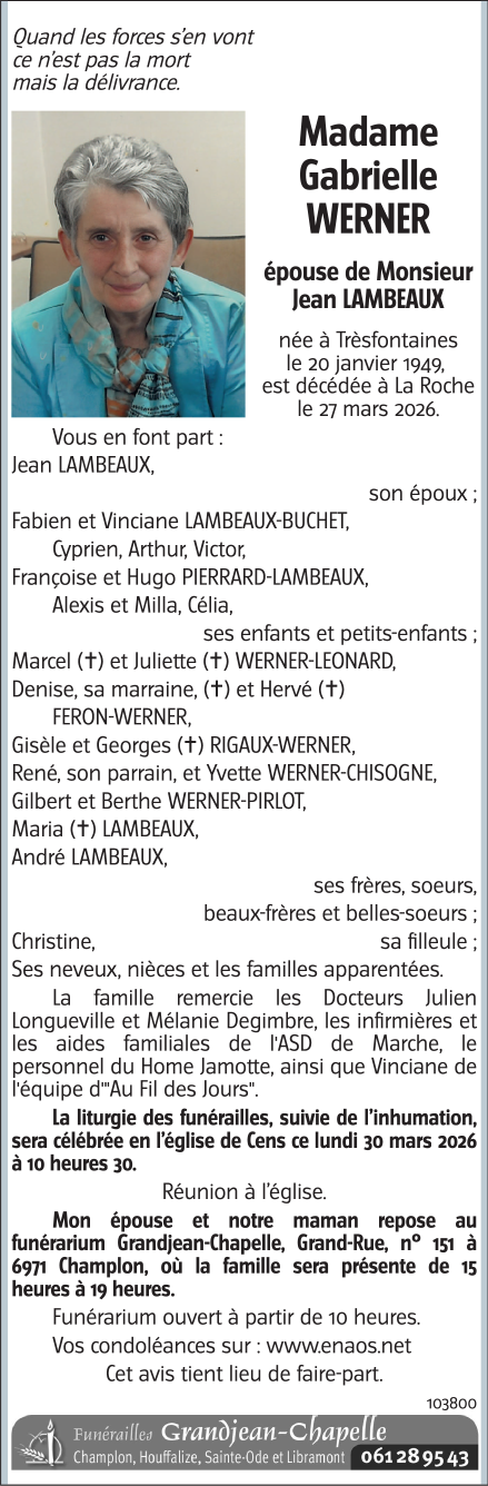 Décédée à La Roche-en-Ardenne (6980) le vendredi 27 mars 2026 à l'âge de 77 ans
