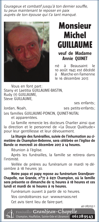 Décédé à Marche-en-Famenne (6900) le samedi 16 décembre 2017 à l'âge de 70 ans