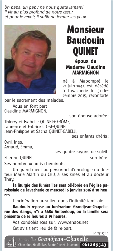 Décédé à Lavacherie (6681) le jeudi 31 décembre 2015 à l'âge de 68 ans