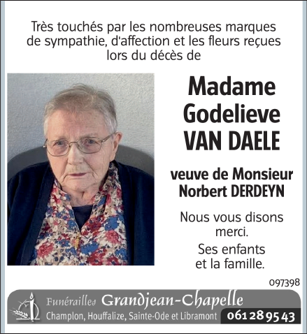 Décédée à Villance (6890) le mardi 18 novembre 2025 à l'âge de 82 ans