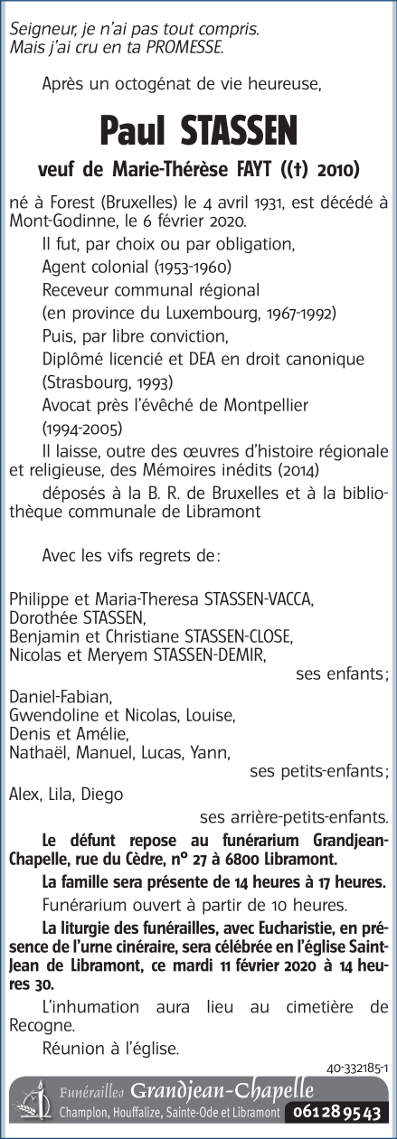 Décédé à Mont-Godinne (5530) le jeudi 6 février 2020 à l'âge de 88 ans