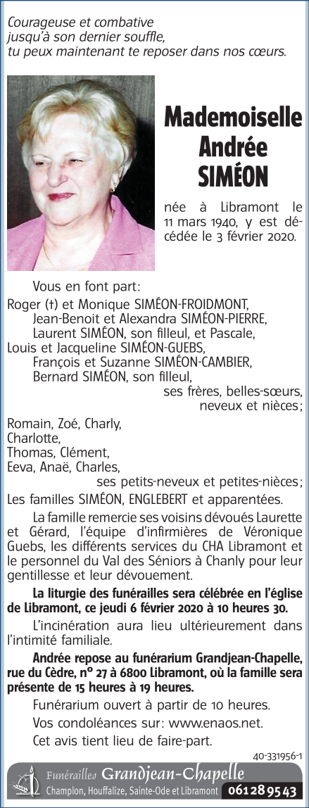 Décédée à Libramont (6800) le lundi 3 février 2020 à l'âge de 79 ans