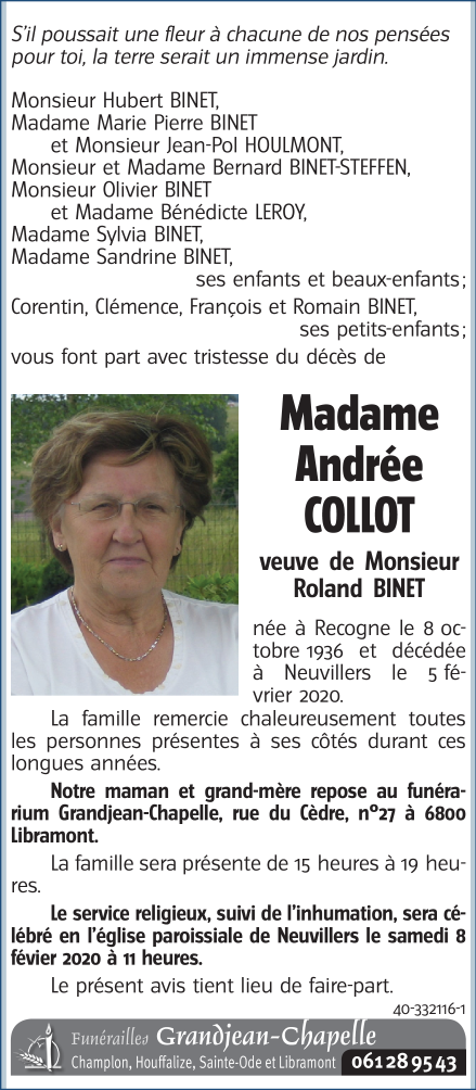 Décédée à Neuvillers (6800) le mercredi 5 février 2020 à l'âge de 83 ans