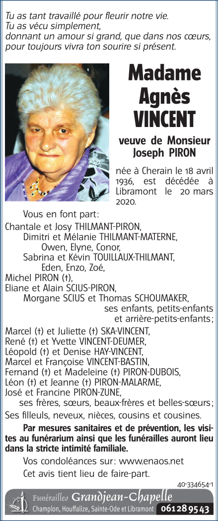 Décédée à Libramont (6800) le vendredi 20 mars 2020 à l'âge de 83 ans