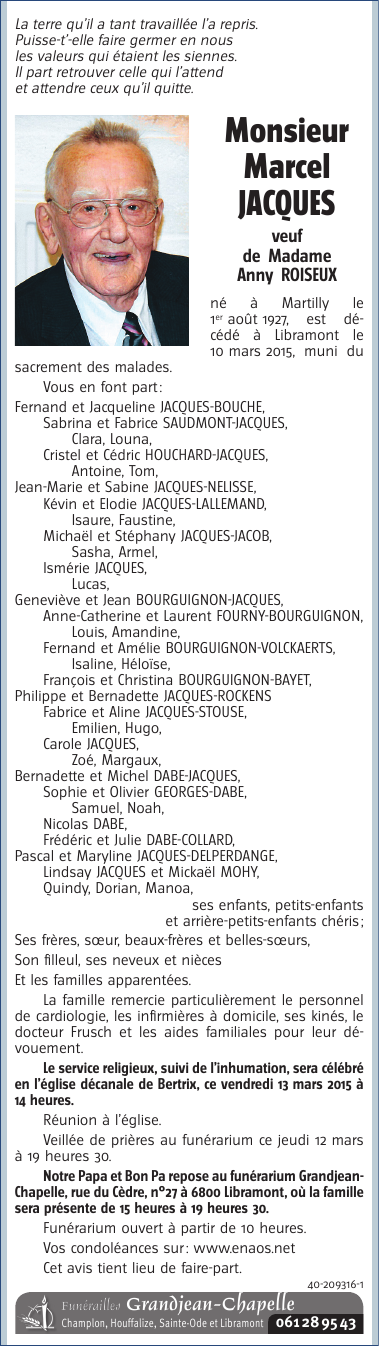 Décédé à Libramont (6800) le mardi 10 mars 2015 à l'âge de 87 ans