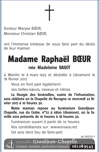 Décédée à Libramont (6800) le samedi 18 février 2017 à l'âge de 91 ans