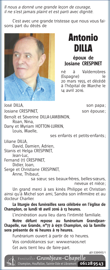 Décédé à Aye (6900) le jeudi 14 avril 2016 à l'âge de 61 ans