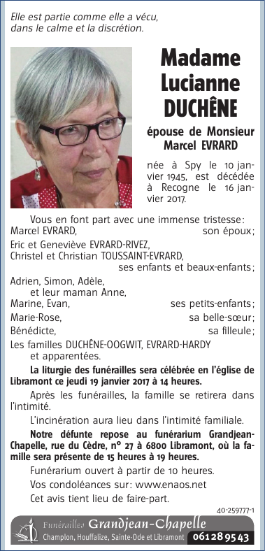 Décédée à Recogne (6800) le lundi 16 janvier 2017 à l'âge de 72 ans