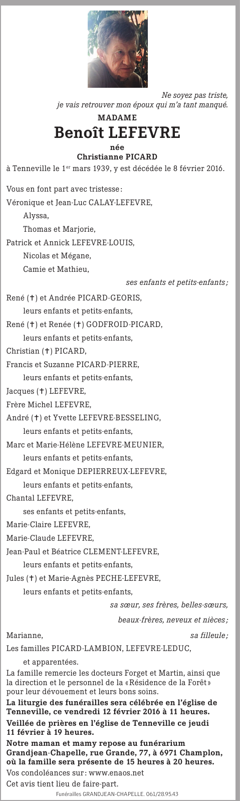 Veuve de Monsieur Benoît LEFEVRE