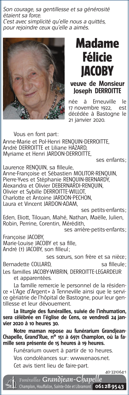Décédée à Bastogne (6600) le mardi 21 janvier 2020 à l'âge de 97 ans