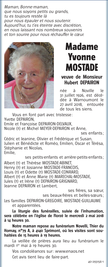 Décédée à Florzé (4140) le vendredi 27 avril 2018 à l'âge de 91 ans
