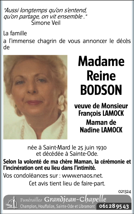 Décédée à Sainte-Ode (6680) le jeudi 17 février 2022 à l'âge de 91 ans
