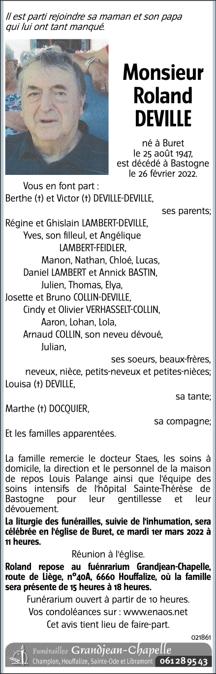 Décédé à Bastogne (6600) le samedi 26 février 2022 à l'âge de 74 ans