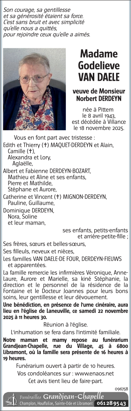 Décédée à Villance (6890) le mardi 18 novembre 2025 à l'âge de 82 ans