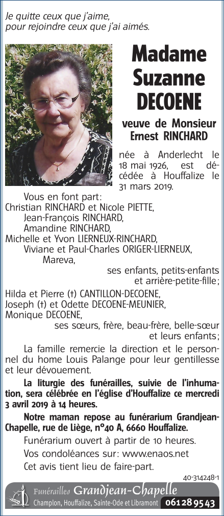 Décédée à Houffalize (6660) le dimanche 31 mars 2019 à l'âge de 92 ans