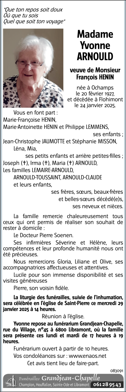 Décédée à Flohimont (6800) le vendredi 24 janvier 2025 à l'âge de 97 ans