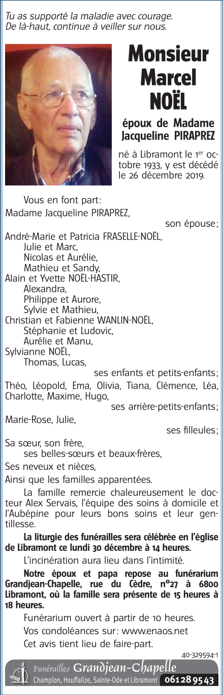 Décédé à Libramont (6800) le jeudi 26 décembre 2019 à l'âge de 86 ans