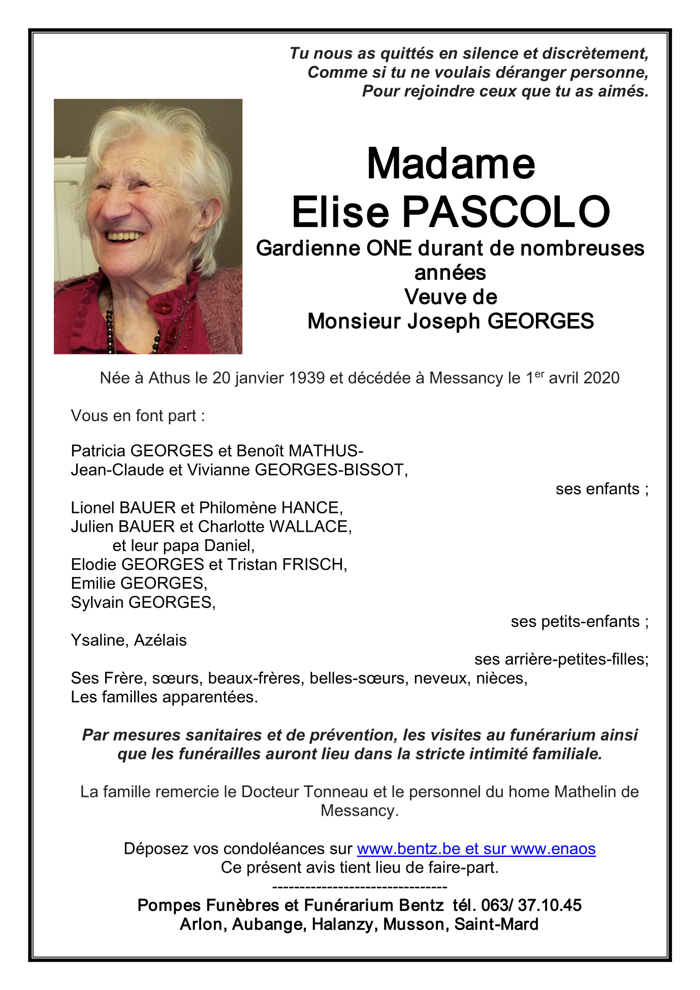 Décédée à Messancy (6780) le mercredi 1 avril 2020 à l'âge de 81 ans