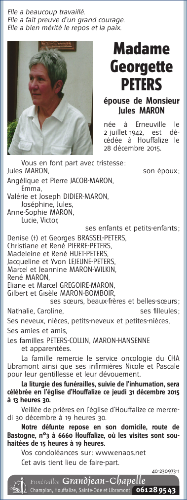 Décédée à Houffalize (6660) le lundi 28 décembre 2015 à l'âge de 73 ans