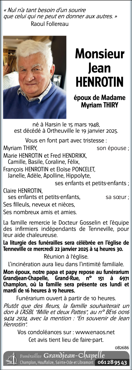 Décédé à Ortheuville (6970) le dimanche 19 janvier 2025 à l'âge de 76 ans