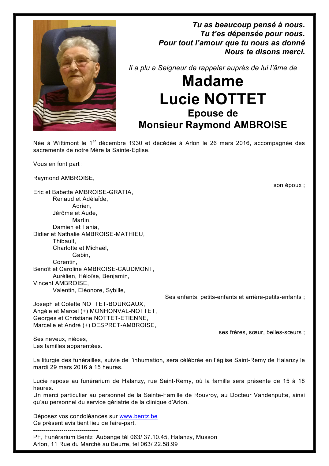 Décédée à Arlon (6700) le samedi 26 mars 2016 à l'âge de 85 ans