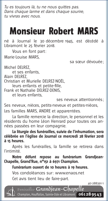 Décédé à Libramont (6800) le dimanche 25 février 2018 à l'âge de 72 ans