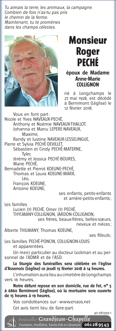 Décédé à Bernimont (6860) le lundi 12 février 2018 à l'âge de 89 ans
