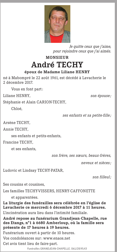 Décédé à Lavacherie (6681) le samedi 2 décembre 2017 à l'âge de 56 ans