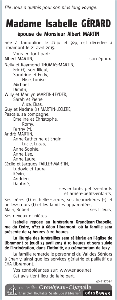 Décédée à Libramont (6800) le mardi 21 avril 2015 à l'âge de 85 ans