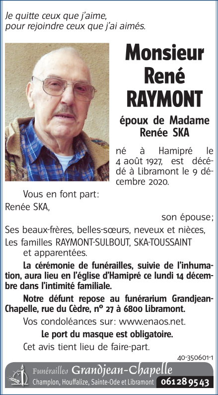 Décédé à Libramont (6800) le mercredi 9 décembre 2020 à l'âge de 93 ans