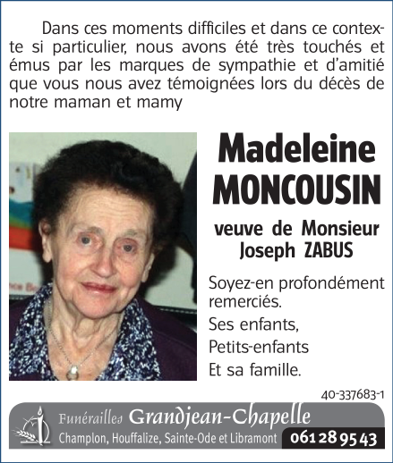 Décédée à Houmont (6680) le mardi 7 avril 2020 à l'âge de 85 ans