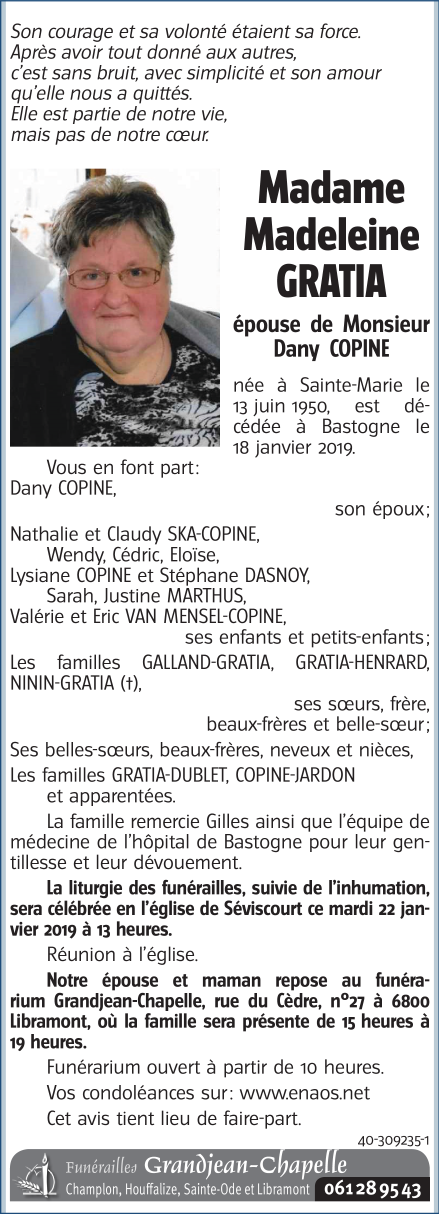 Décédée à Bastogne (6600) le vendredi 18 janvier 2019 à l'âge de 68 ans