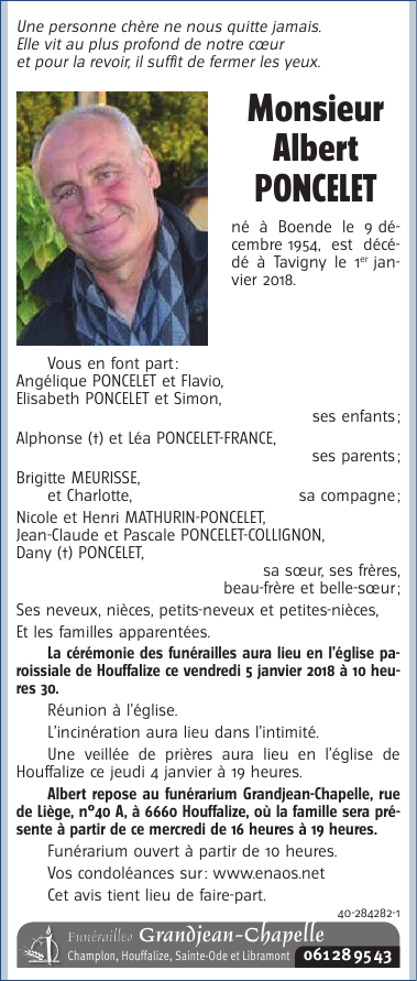 Décédé à Tavigny (6662) le lundi 1 janvier 2018 à l'âge de 63 ans