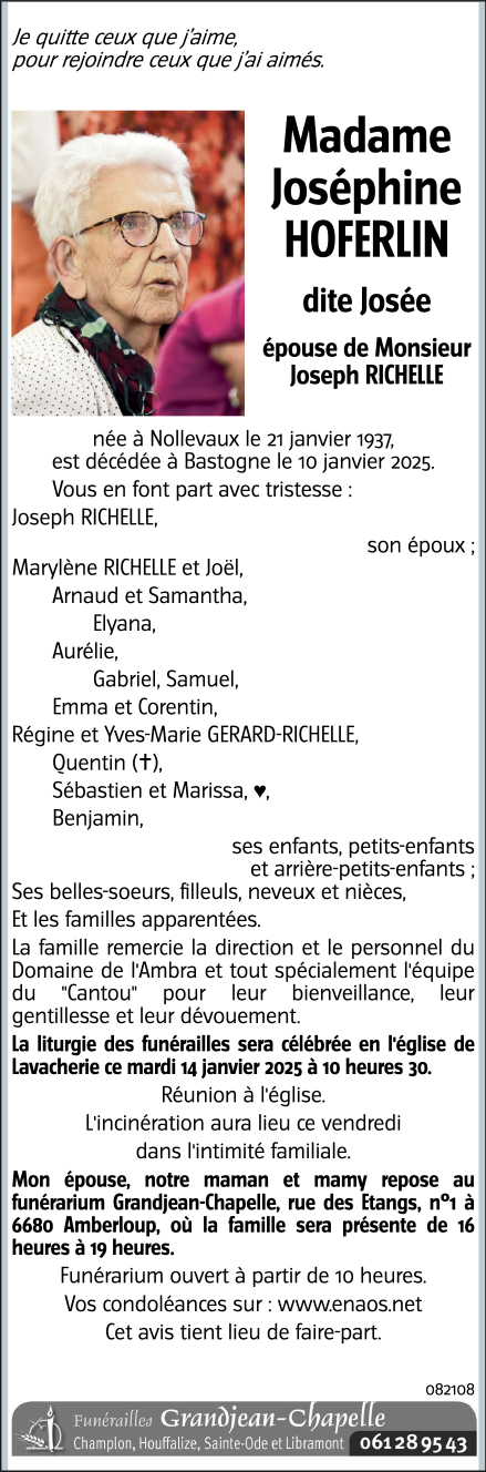Décédée à Bastogne (6600) le vendredi 10 janvier 2025 à l'âge de 87 ans