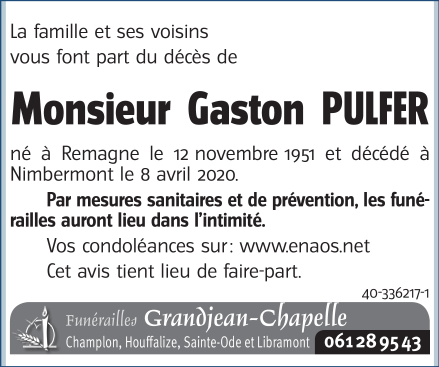 Décédé à Nimbermont (6800) le mercredi 8 avril 2020 à l'âge de 68 ans