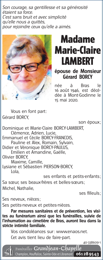 Décédée à Mont-Godinne (5530) le vendredi 15 mai 2020 à l'âge de 73 ans
