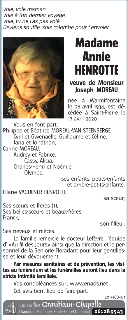 Décédée à Saint-Pierre (6800) le vendredi 17 avril 2020 à l'âge de 85 ans