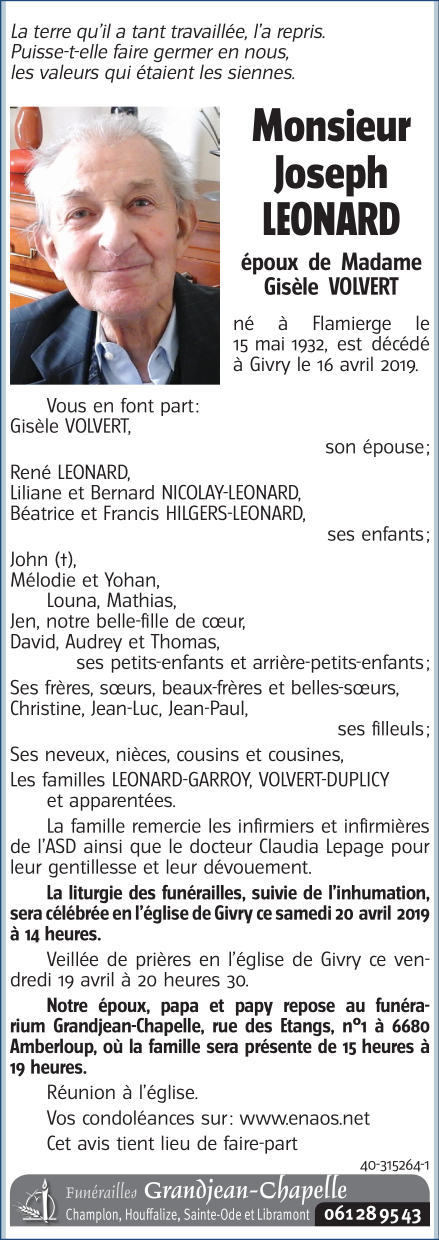 Décédé à Givry (6680) le mardi 16 avril 2019 à l'âge de 86 ans