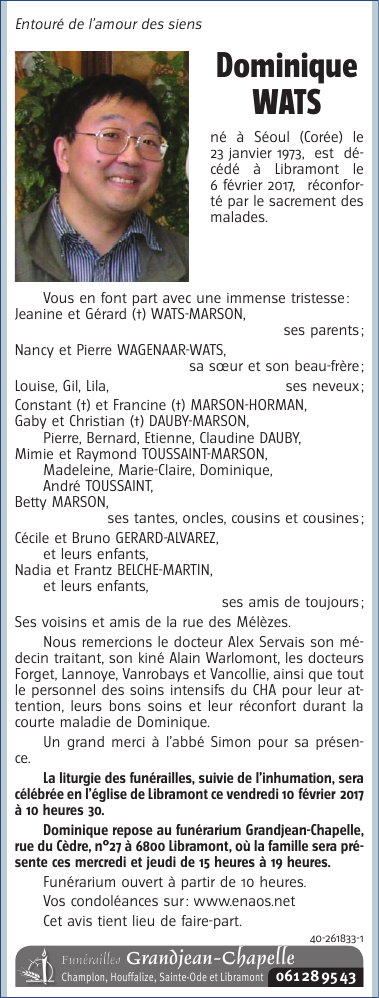 Décédé à Libramont (6800) le lundi 6 février 2017 à l'âge de 44 ans