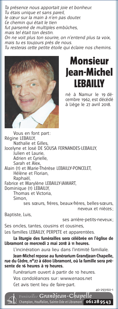 Décédé à Liège (4000) le vendredi 27 avril 2018 à l'âge de 55 ans