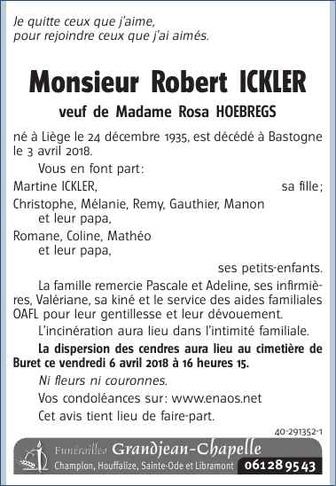 Décédé à Bastogne (6600) le mardi 3 avril 2018 à l'âge de 82 ans